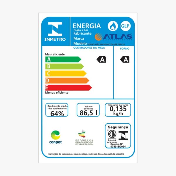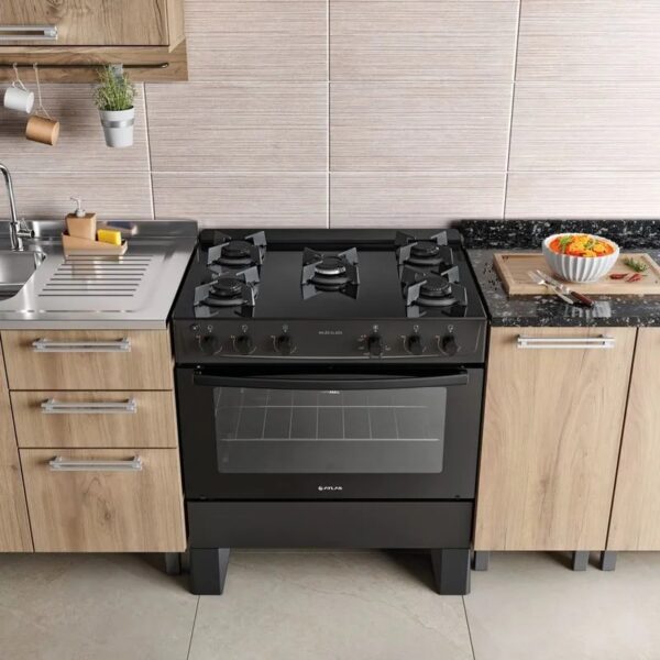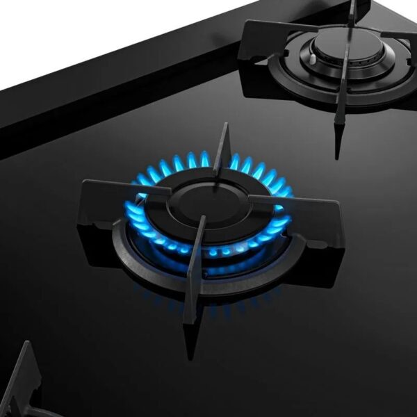 Possui mesa de vidro temperado; acendimento automático; grades individuais de ferro fundido com 4 pontos de apoio; queimadores mais robustos e fáceis de limpar, sendo um deles Mega Chama; além de pés altos e botões removíveis, que facilitam na hora da limpeza. O forno possui capacidade de 86,5 litros, uma grade deslizante e é revestido com o acabamento Limpa Fácil.
