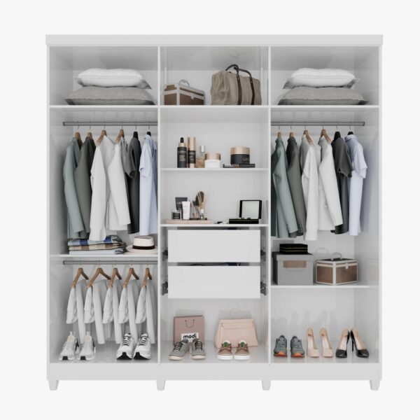 Possui amplo espaço para roupas, calçados e acessórios, contando com prateleiras e gavetas resistentes, ideais para o uso diário. Sua estrutura foi pensada para unir beleza e praticidade, sendo perfeito para quem tem bom gosto e deseja um quarto mais organizado e aconchegante.
